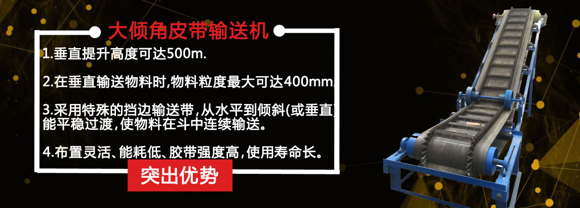 DJ型大傾角皮帶輸送機與普通式輸送機、斗式提升機、刮板輸送機比較其綜合技術性能都非常優越.輸送量大可達6000m3/h垂直提升高度可達500m.在垂直輸送物料時物料粒度較大可達200mm,從水平到傾斜(或垂直)能平穩過渡,能耗低、結構簡單、維護方便、皮帶強度高、使用壽命長.
