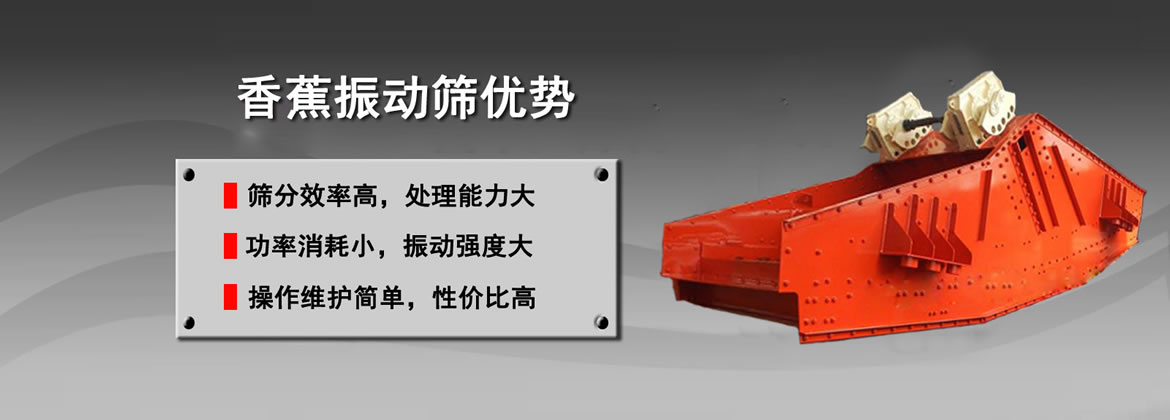 香蕉振動篩在入料端有一斜坡面,先以34°開始,緊接著以一定數目的角度下降到大約為10°的出料端為止。篩面采用不同傾角的折線形式,從入料端到出料端物料層厚度是不變。各段篩面上物料量與流速比值穩定、料層較高,呈現均勻狀態篩分效率顯著提高,比相同有效面積篩分機的處理量提高1-2倍,對于細粒含量高,特別是物料中料度占分級粒度尺寸小于1/2的物料含量較大時,香蕉型振動篩分機具有極高的篩分效率。